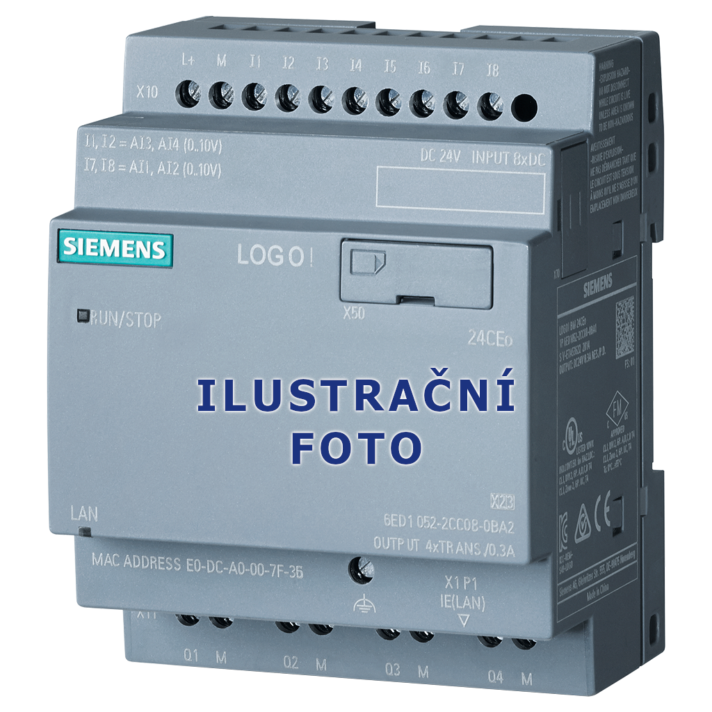 Řídící nebo také logický modul LOGO! 9 24 CEo (6ED1052-2CC08-0BA3) je univerzální PLC modul od Siemens navržený pro napájení 24 V DC. Tento modul disponuje 8 digitálními vstupy (z toho 4 mohou sloužit jako analogové 0-10 V) a 4 tranzistorovými výstupy s maximálním proudem 0,3 A.